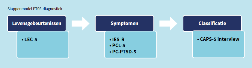 Om behandelaren op weg te helpen is er een stappenmodel met voorkeursinstrumenten in de richtlijn opgenomen (zie afbeelding). De eerste stap is in kaart brengen óf een cliënt te maken heeft gehad met ingrijpende en/of stressvolle gebeurtenissen. Zo ja, dan is de tweede stap het gestructureerd inventariseren van symptomen. Gezien de beperkte tijdsinvestering en beperkte emotionele last raadt de richtlijn voor de eerste check de Life Events Checklist for DSM-5 (LEC-5) aan. Voor de vervolgstap gaat de voorkeur uit naar een van drie vragenlijsten: de Impact of Event Scale-Revised (IES-R), PTSD Checklist for DSM-5 (PCL-5) of The Primary Care PTSD Screen for DSM-5 (PC-PTSD-5). Daarbij moet wel opgemerkt worden dat deze keuze niet rust op studies met hoge bewijskracht. “We hebben vooral de eenheid van het diagnostisch proces willen bevorderen”, vertelt Schoorl, “en deze vragenlijsten zijn het meest onderzocht.” Pas wanneer er een gegrond vermoeden van PTSS is volgt een klinisch interview, bij voorkeur de Clinician-Administered PTSD Scale for DSM-5 (CAPS-5).